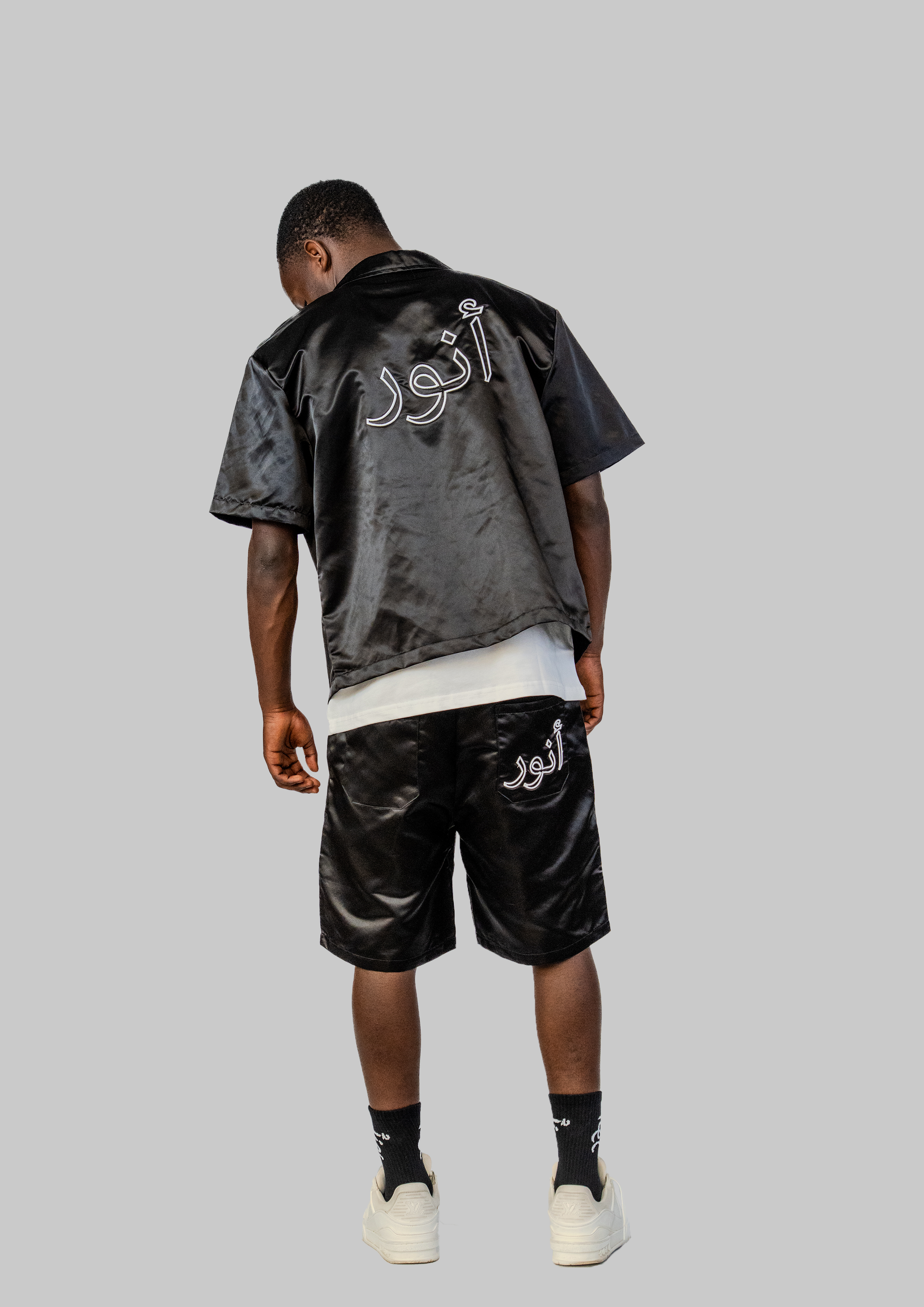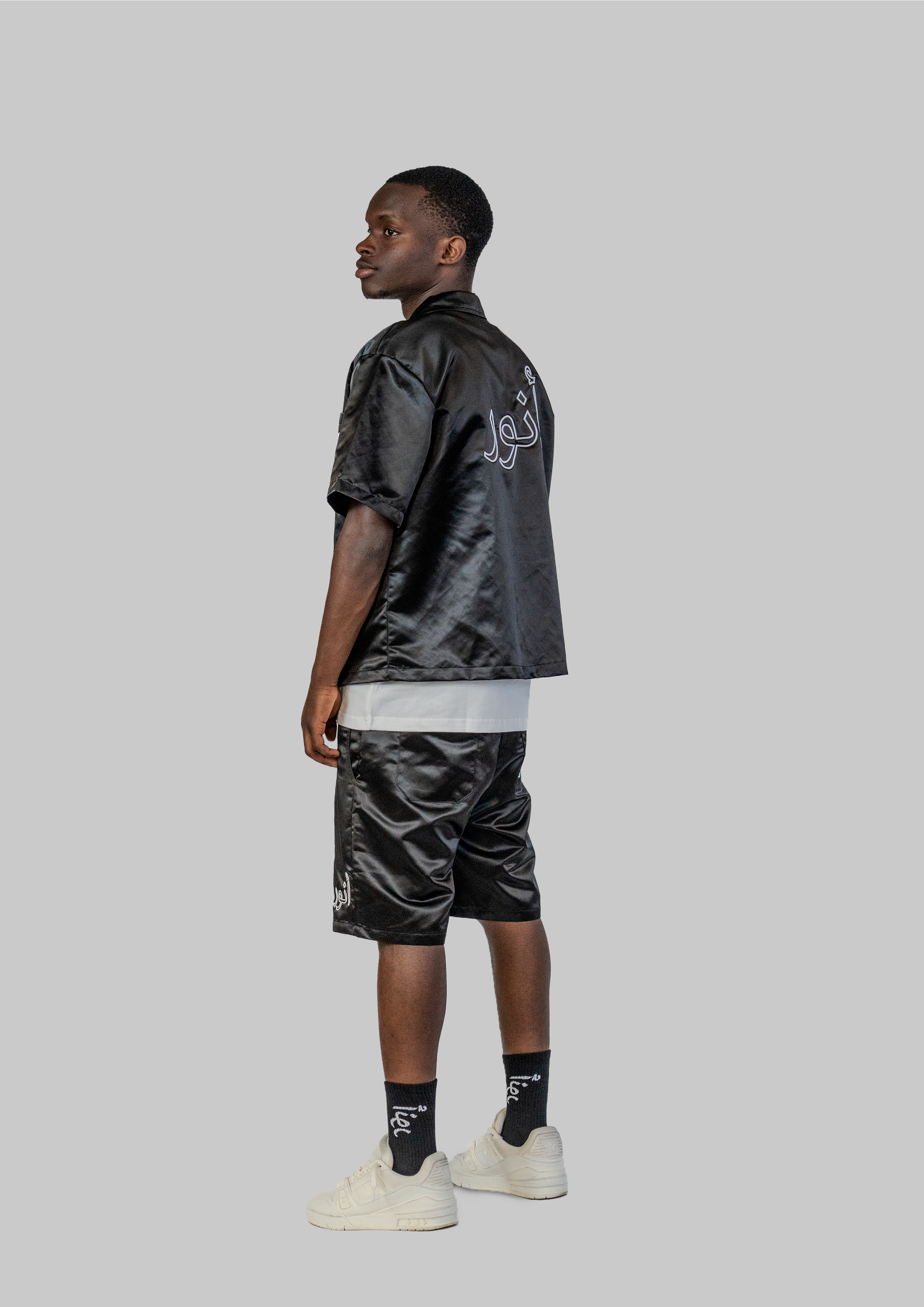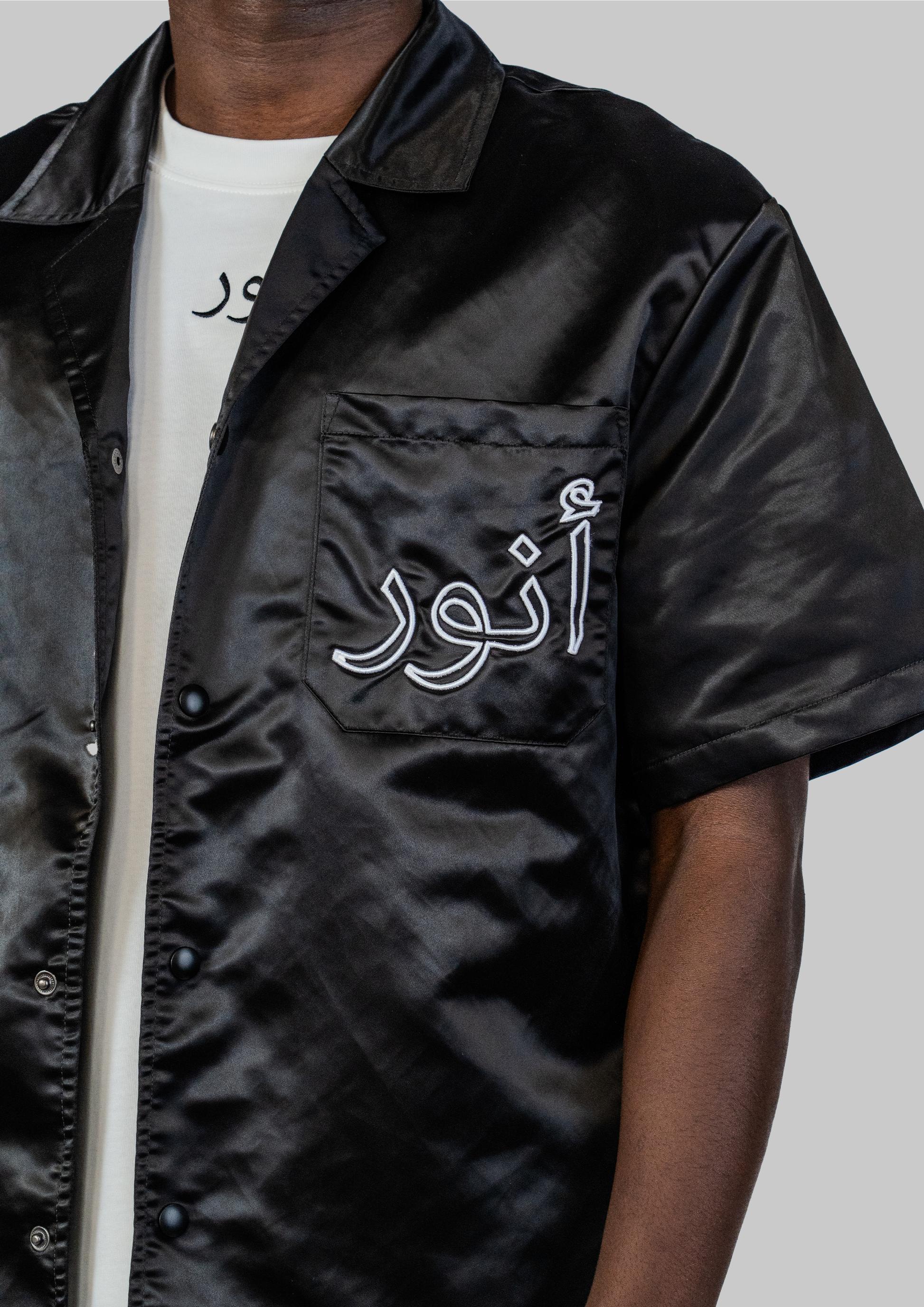 The short-sleeved, boxy-fit shirt showcases an embroidered logo on the breast pocket and a larger logo embroidered on the back. Made from premium nylon fabric, it features a distinctive bowling collar and snap closure.