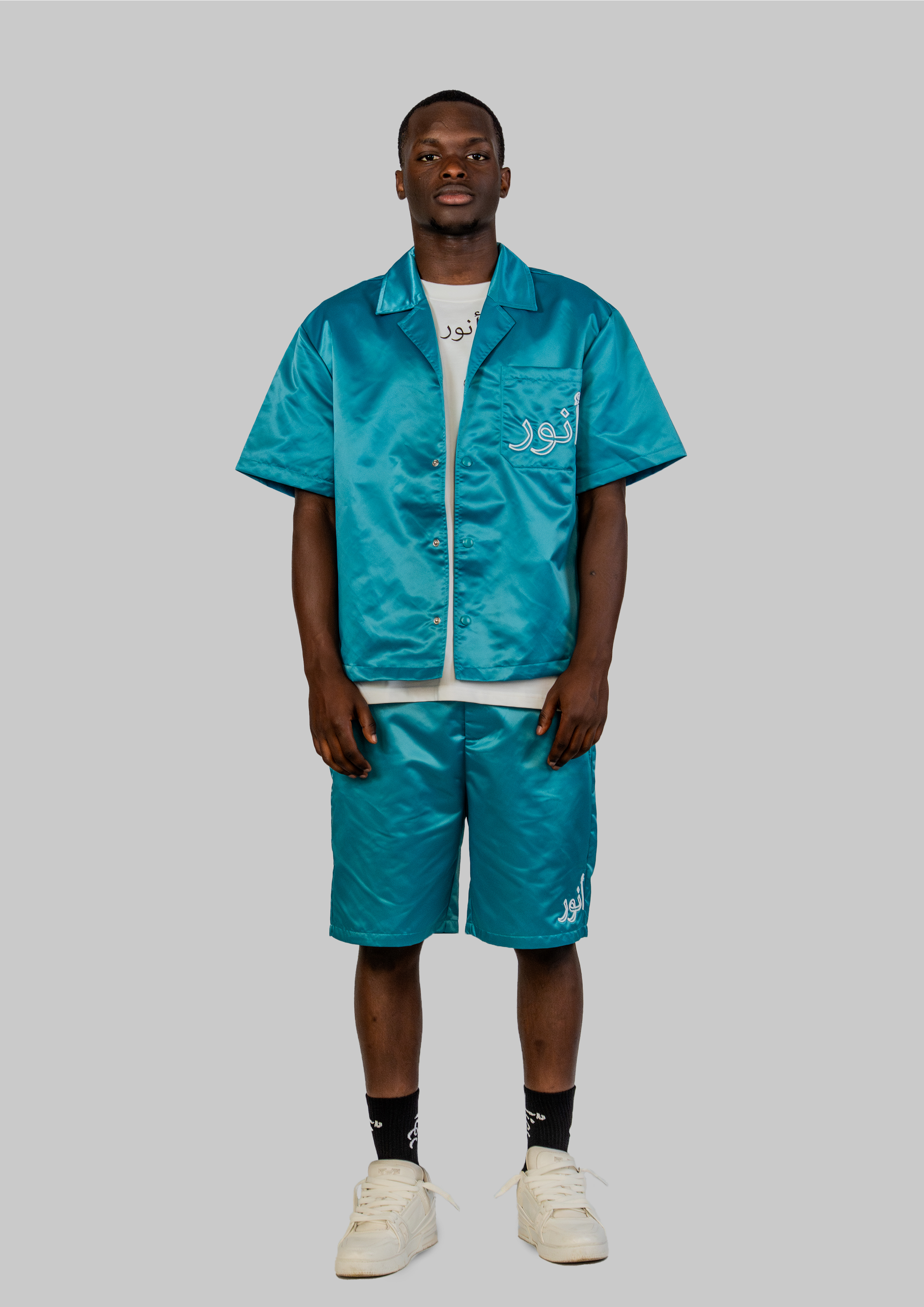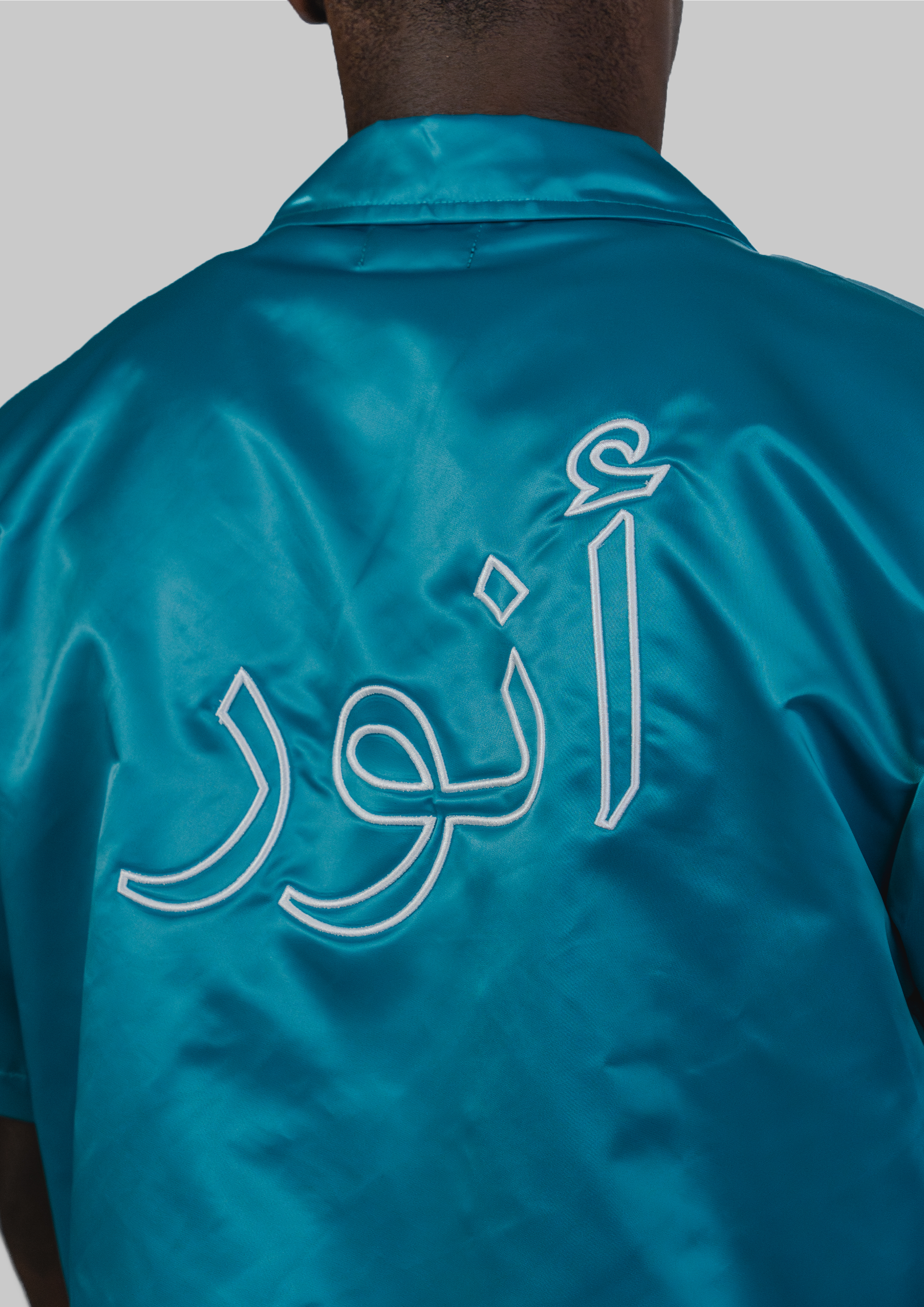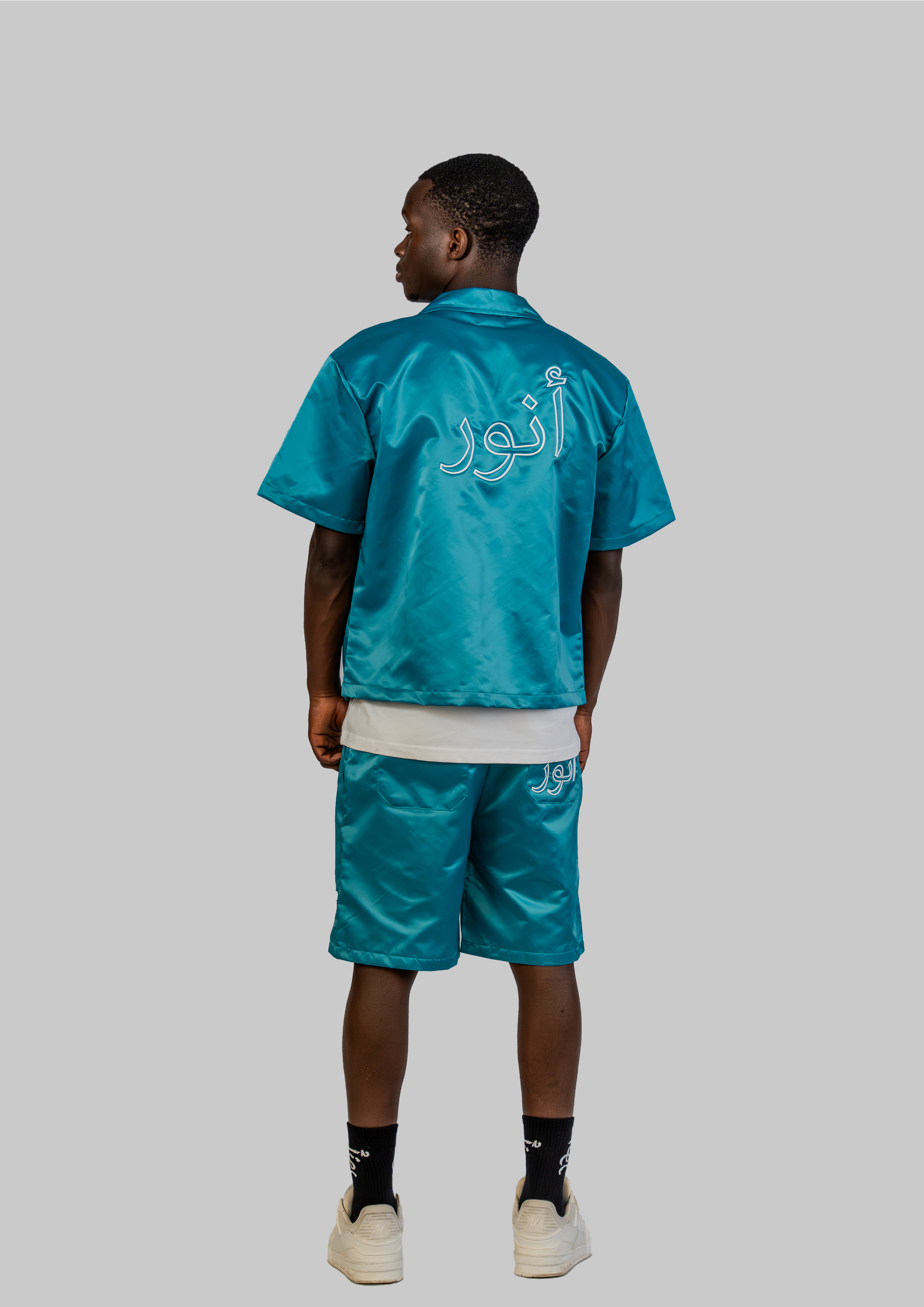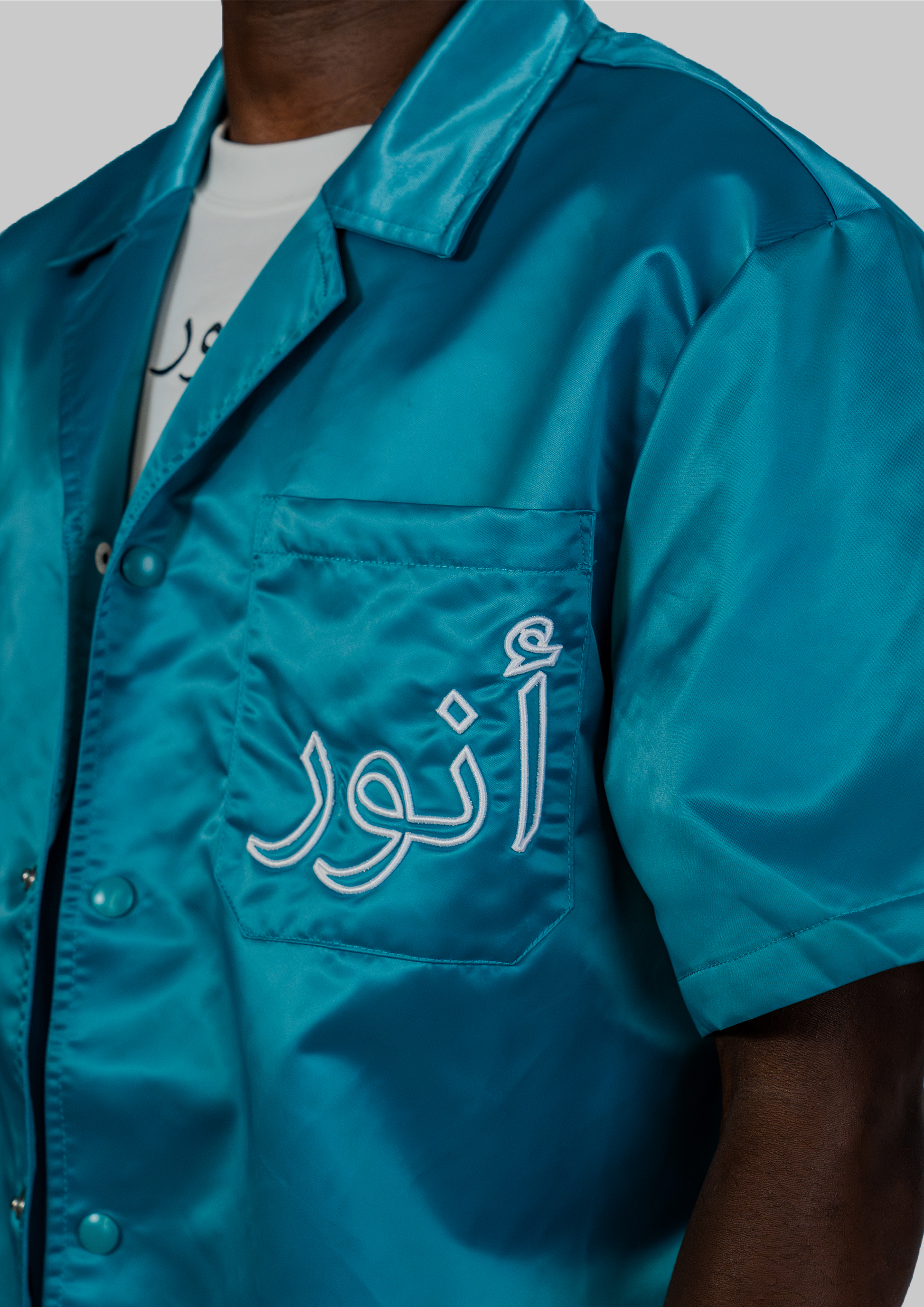 The short-sleeved, boxy-fit shirt showcases an embroidered logo on the breast pocket and a larger logo embroidered on the back. Made from premium nylon fabric, it features a distinctive bowling collar and snap closure.